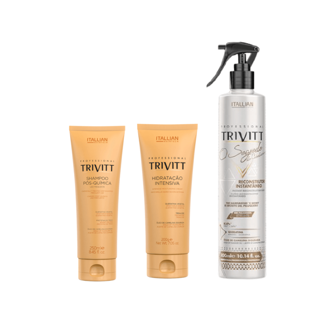 Lave os cabelos com o Shampoo Trivitt, aplique o Reconstrutor Instantâneo Trivitt e massageie do comprimento às pontas. Deixe agir por 3 minutos. Sem enxaguar, aplique a Hidratação Intensiva Trivitt, envolva totalmente os fios e deixe agir por mais 5 minutos. Enxágue e finalize como desejar.